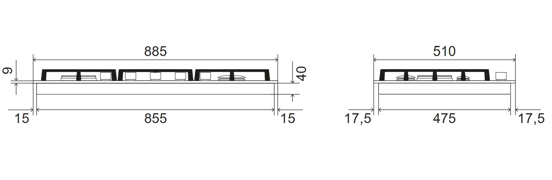 • Малая конфорка Ø 65 мм 2 x 1,75 кВт / 0,7 кВт